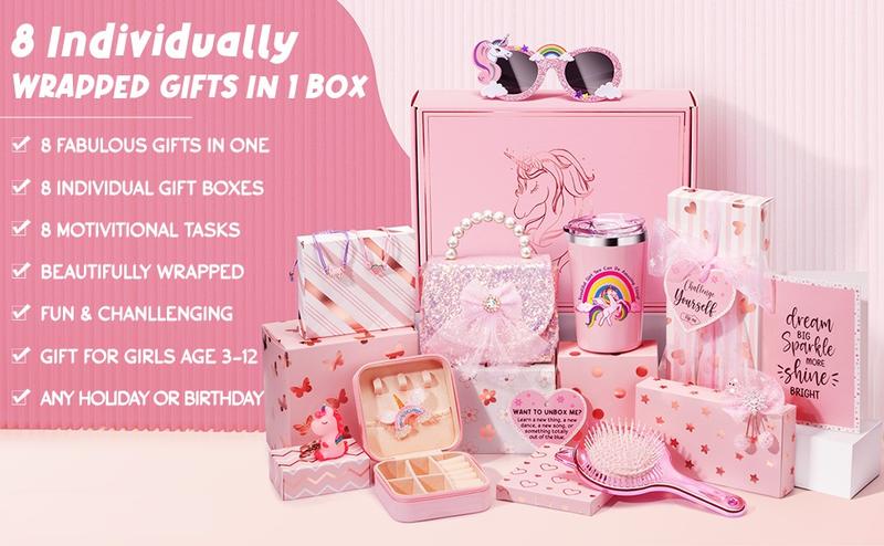 • 8-in-1 Unicorn Gift Box: Includes 12oz insulated tumbler, princess crossbody handbag, jewelry box, 5 hairpins, 2 bracelets, sunglasses, keychain, cat-shaped comb, star ribbons, task tags, gift card & rose gold gift boxes.