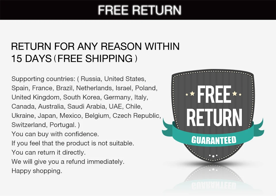 FREE RETURN-Return for any reason within 15 days(free shipping) Supporting countries: (USA, Canada, Australia, UK, France, Germany, Spain, Russia,Brazil, Israel, South Korea, Saudi Arabia, UAE, Poland, Netherlands, and Italy).
